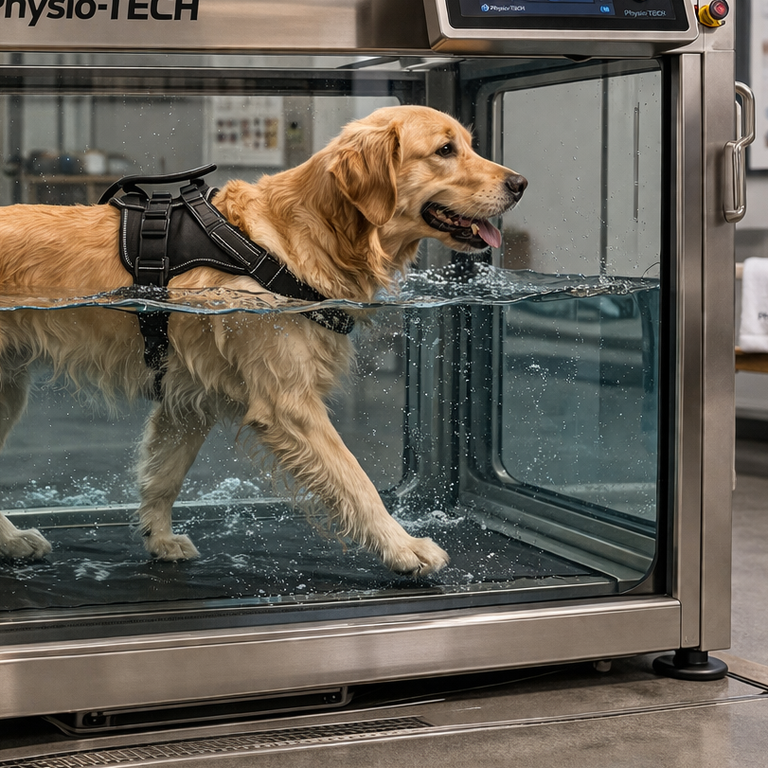 Ihr Hund läuft in einem speziell entwickelten Wasserlaufband, während der Wasserstand individuell angepasst wird. Dadurch wird eine gelenkschonende Bewegung ohne Überlastung sichergestellt. Durch den natürlichen Wasserauftrieb wird die Belastung auf die Gelenke und Wirbelsäule um bis zu 60% reduziert - so kann sich Ihr Hund sicher und schmerzfrei bewegen.